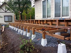 別荘地という湿気が多く天然木のウッドデッキではすぐに腐ってしまう。そこでウッドデッキ材の王様と呼ばれるイペ材を使用し、更に躯体も頑丈な設計に変更しました。(前橋市)
