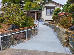 高齢のお客様で足が思うように動かなくなってしまい、入口の石段を乗り降りするのが大変で危険だということ。ですが、若い頃に作ったお気に入りの庭を壊したくないというお話でした。そこで、階段に使用していた石をスロープ脇の土留に無駄無く使用して仕上げました。仕上がりを心配していたおじいちゃんも納得頂き喜んで頂きました。(太田市)