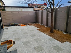 限られたスペースですが、周囲の目線を気にせずにくつろげる場所を作りたいとのご要望。樹脂フェンスを使い、周囲を囲い排水性の高いインターロッキングを敷いてくつろぎ空間を作りました。(館林市)