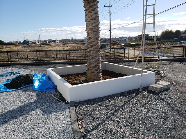 ヤシの木の下に囲ったブロックを綺麗にお化粧。