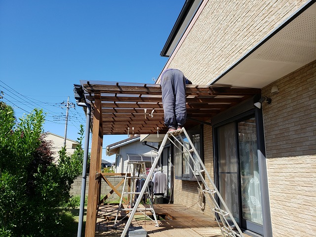 今回の工事は10数年前に作られたデッキ&テラス屋根の作り替え。