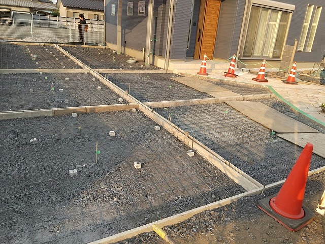 工事初期に駐車場の下地を作る事によって土間コンを打つまでに何度も