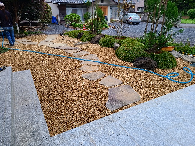 大量の砂利を敷いてホースを使い汚れを洗い流します。