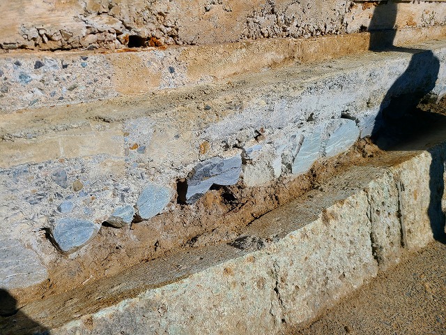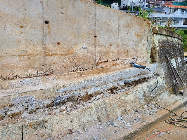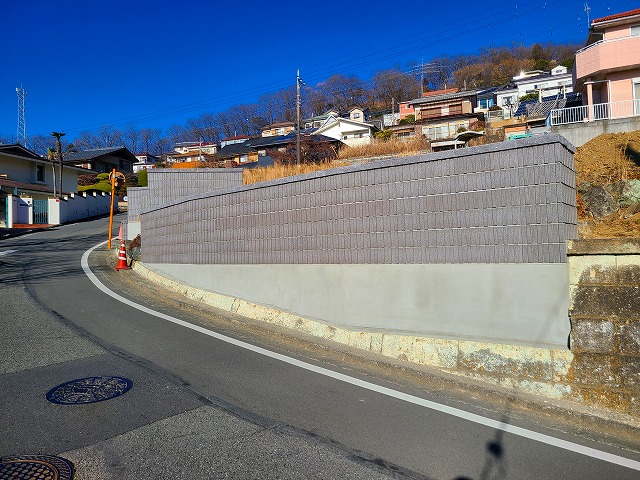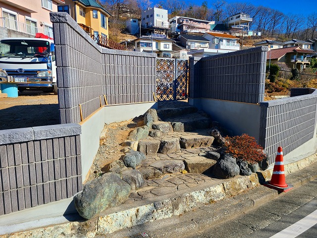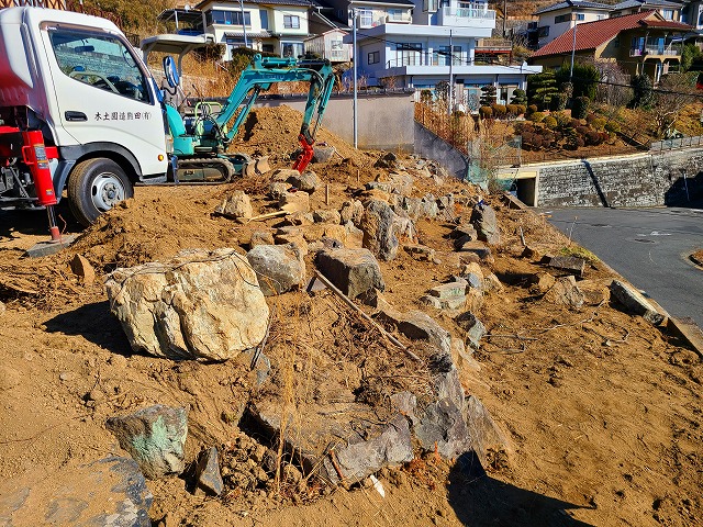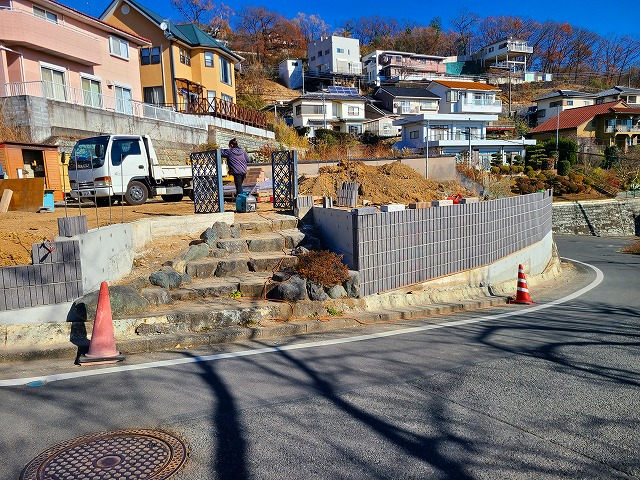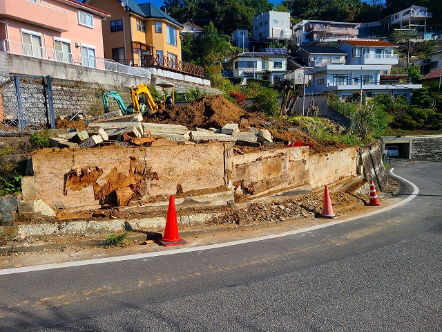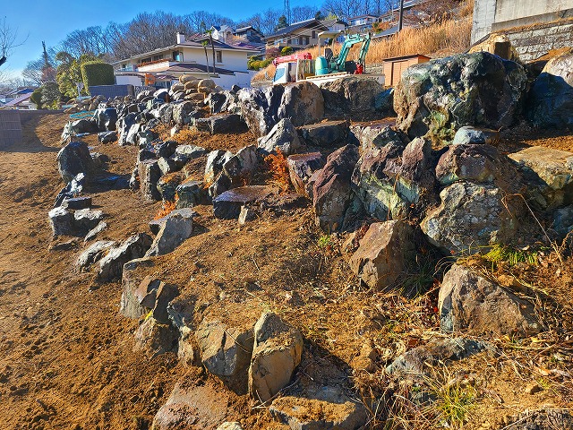 擁壁のベース部分の玉石があらわになっており・・・そのままでは地震で揺れるごとに不安が残ります。