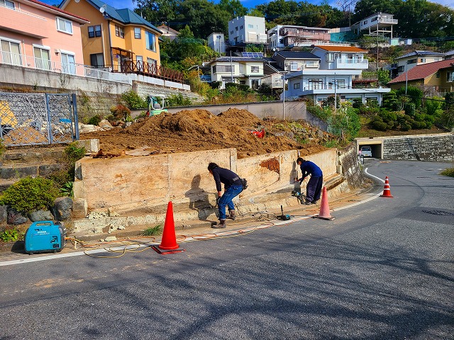 更に既存の擁壁とガッチリと接続した強固な土留を作ります。