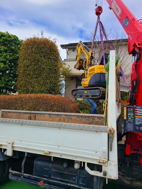 ユンボを吊るし込み樹木の伐採・伐根を行っていきます。