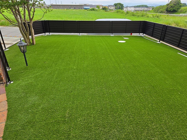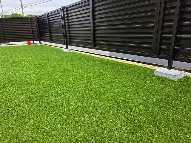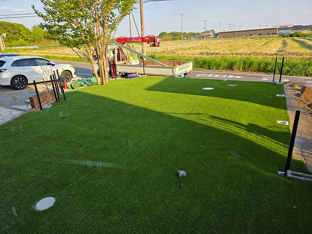 今回は水道屋さんにお願いしてしっかり人工芝とレベルを揃えてもらいます。