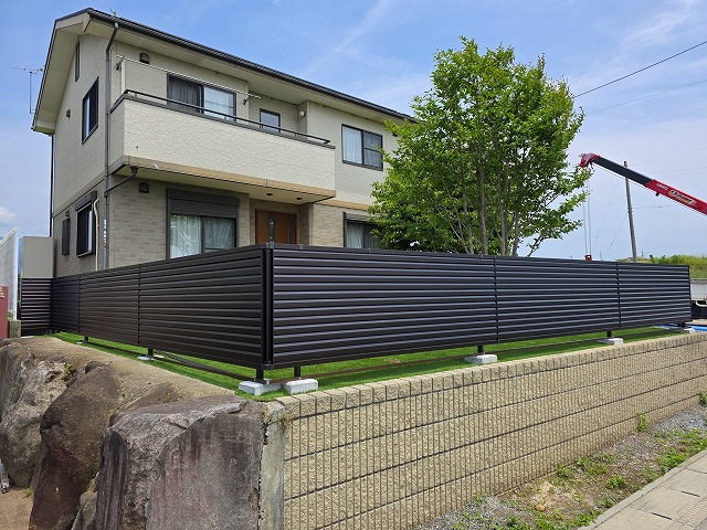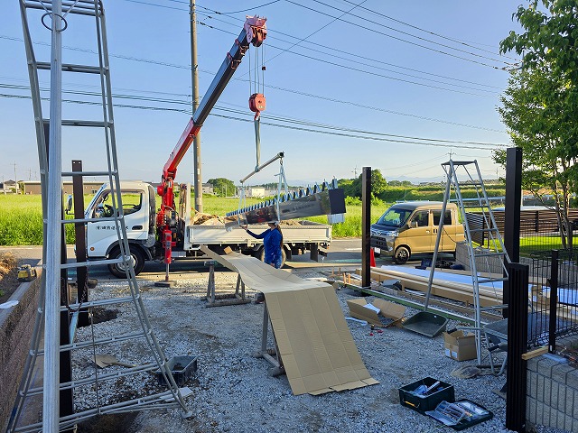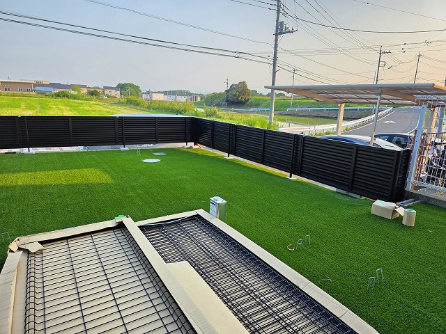 そして、あらかじめ設置しておいたフェンスブロックに柱を立てて目隠しフェンスとメッシュフェンスの取り付け。
