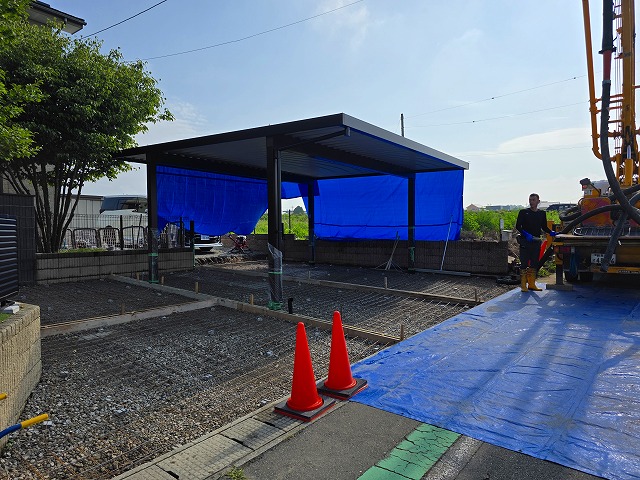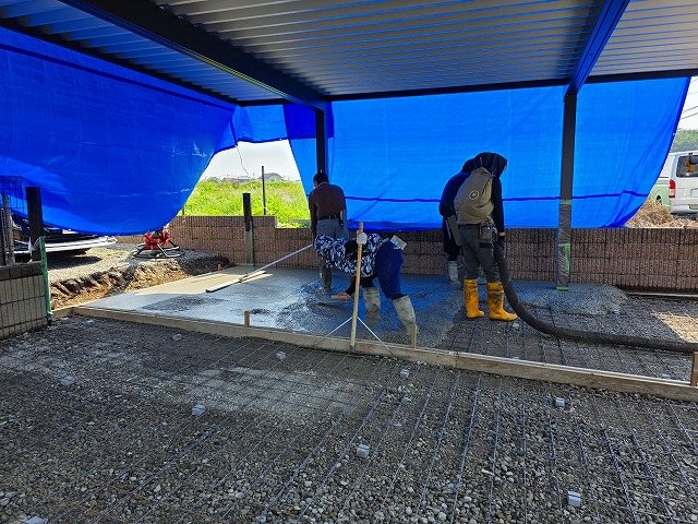 土間屋さんが重たい生コンを軽々均し平らにしていきます。