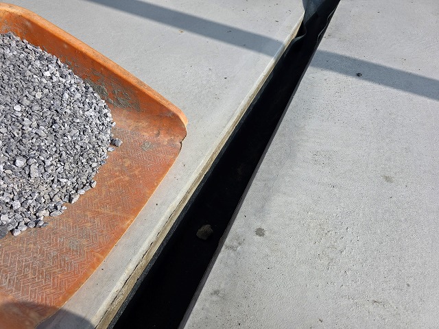 土間コンのスリットに防草シートを仕込み砂利入れ。