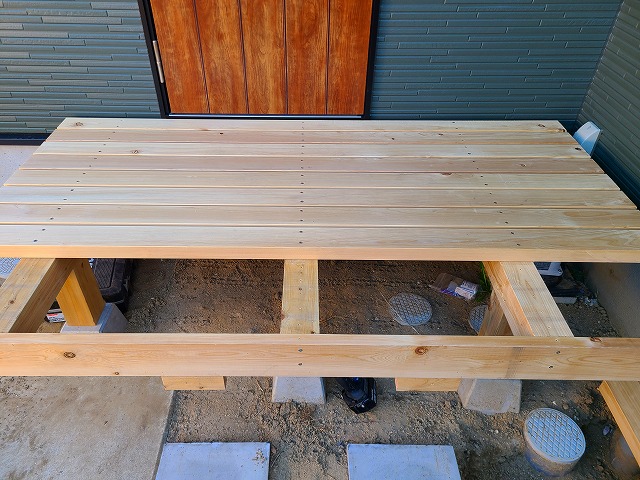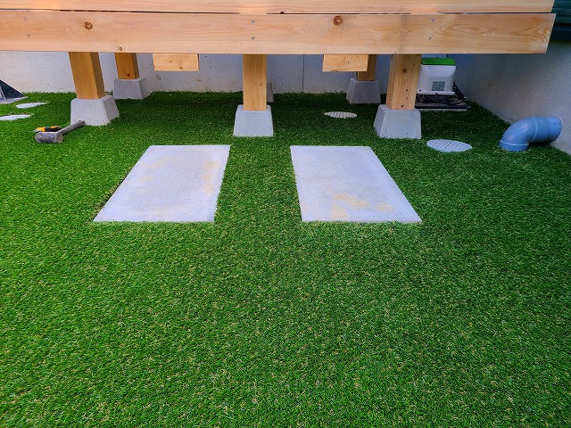 デッキ下も苦戦しながらもしっかりと施工し、雑草の生える隙間を無くします。