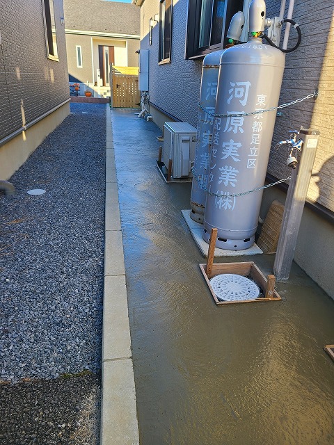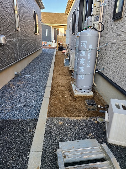 そこへ樹脂を混ぜた砂利を敷いておしゃれなアプローチへ変身!!