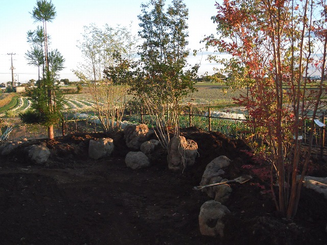 そのマキの木を中心に植え、既存の浅間の焼け石を配置し・・・