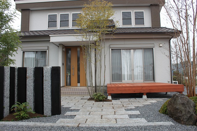 アプローチには御影石の敷石を使い、門柱には御影石の柱と枕木を組み合わせました。