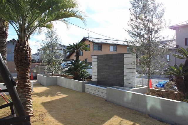 ココスヤシ/壁泉(ウォーターフィーチャー)/白壁(櫛引き仕上げ)/ウッドデッキ/レッドロック敷き/防草シート/芝生施工/南国植栽(ソテツ・ユッカロストラータ)/外構照明