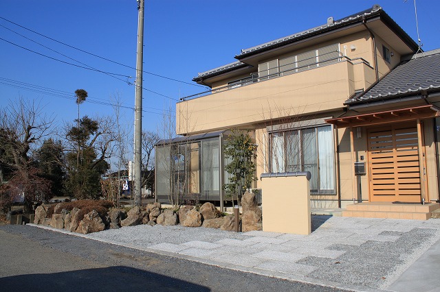 アプローチは御影石ですが、駐車スペース兼用になるため