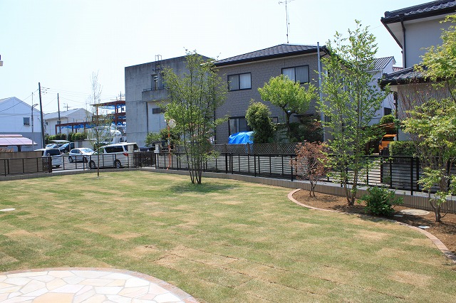 優しいアールに包まれた広々と開放感豊かなお庭が出来上がりました(^^)