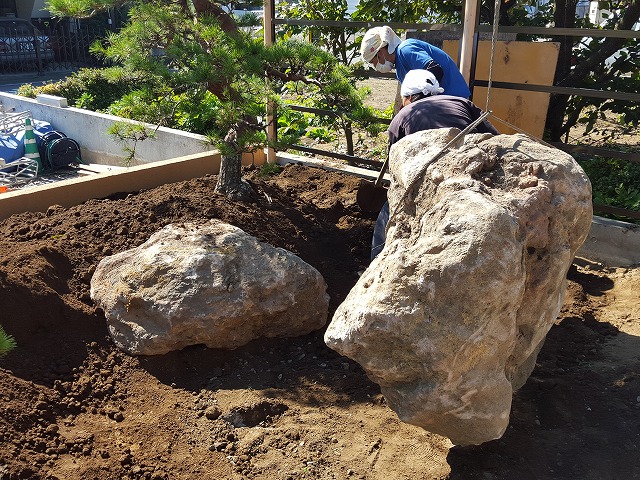 植栽と同時に石組みも開始!!