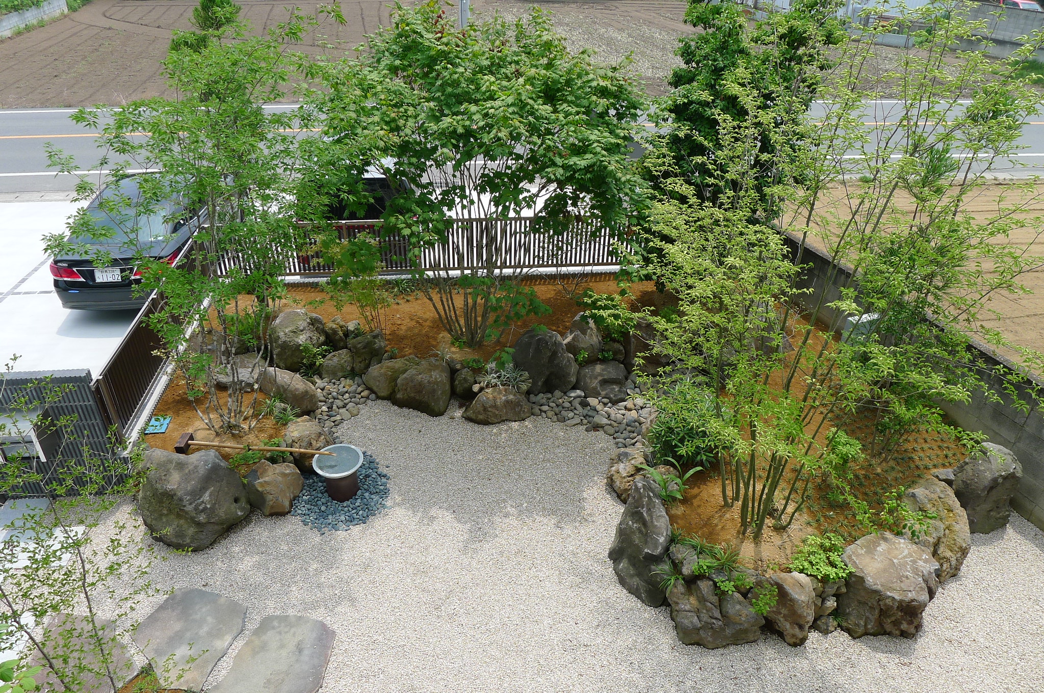 第二陣の植木と石をバランスを見ながら所定の場所に植え込んでいきます。